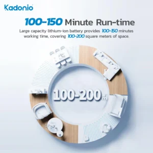 5. 100-150 Minutes Long Battery Life:Kadonio robot vacuum cleaners are equipped with efficient batteries that provide sufficient runtime for cleaning larger spaces up to 150-200 Square meters.. When their battery is low, they can autonomously return to their docking station for recharging.