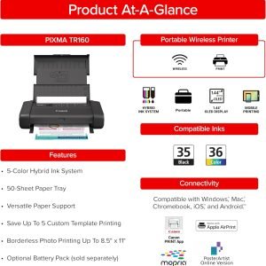 PIXMA TR160 Wireless Portable Printer, 50-Sheet Paper Tray and 1.44″ Display